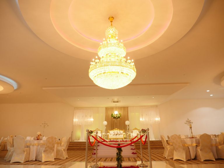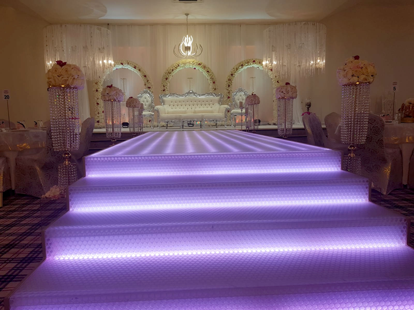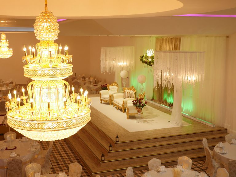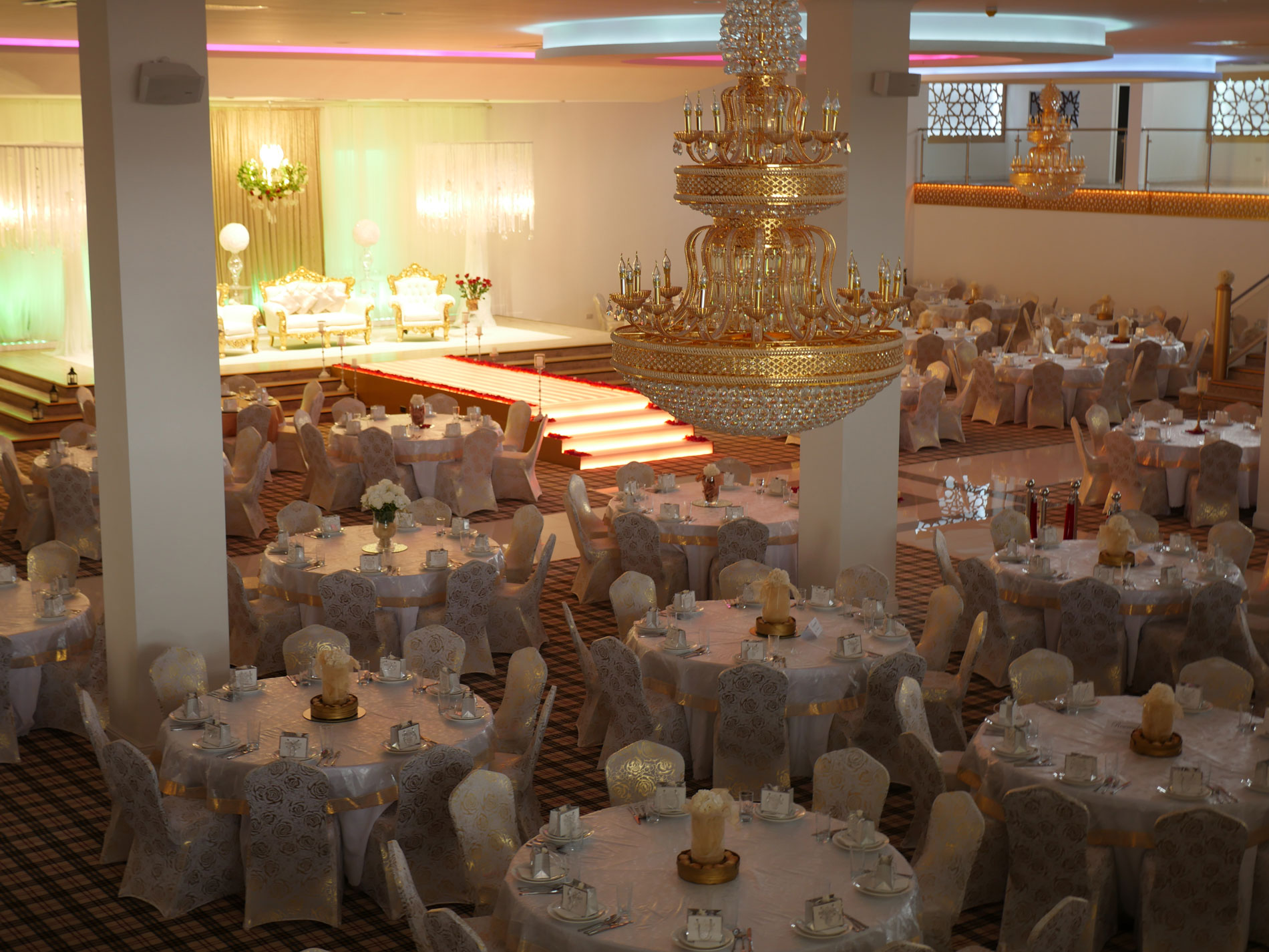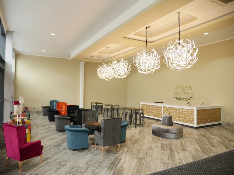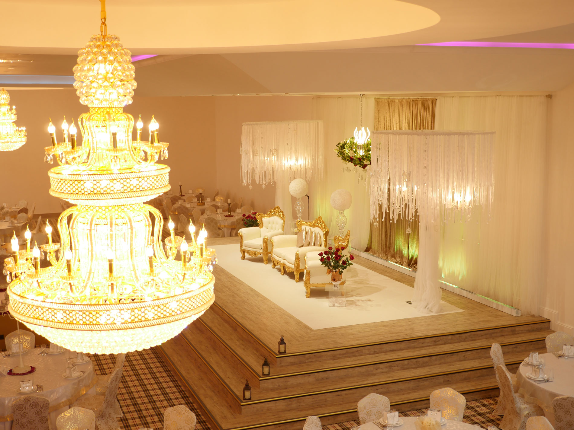 The Grand Venue – Catwalk (purple) The Grand Venue – seating arrangement The Grand Venue – seating with cake stand The Grand Venue – chandelier The Grand Venue – conference seating